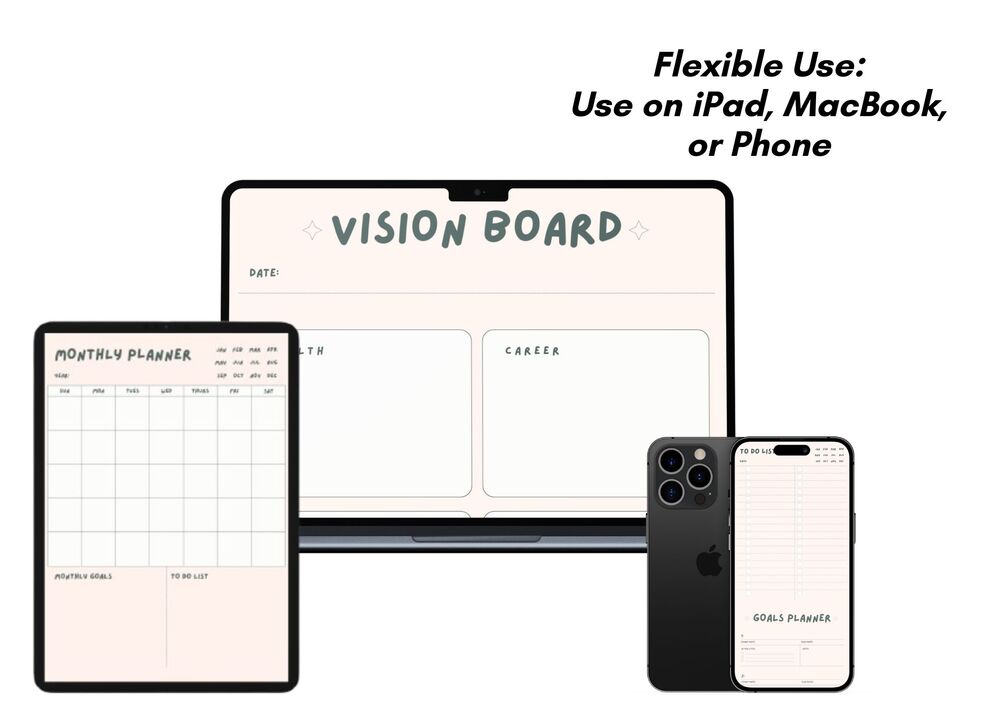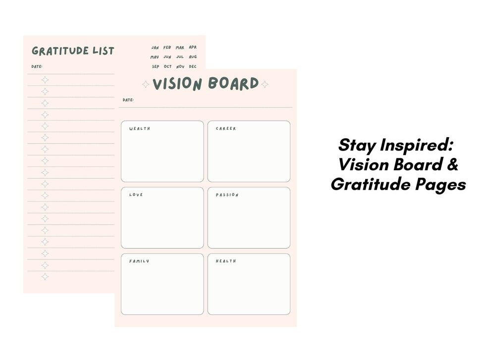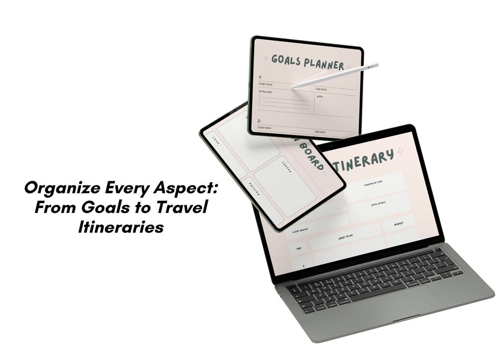 - Goals Planner, Vision Board, and Travel Itinerary Pages